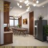 Để tránh phải lắp đặt quá nhiều đèn trong một không gian gây tốn kém KTS thiết kế bố cục không gian nội thất phòng khách liền bếp giúp lưu thông không khí, ánh sáng tối đa, vừa đảm bảo thông thoáng cho không gian sống. Ánh sáng tự nhiên sau khi được tận dụng sẽ được tính toán kết hợp với bố trí ánh sáng nhân tạo một cách khoa học giúp làm bóng, sang thêm đồ nội thất gia đình.