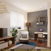 Hệ thống tủ, cửa sổ, cửa ra vào sử dụng gỗ công nghiệp chống ẩm chất lượng cao chống cong vênh trong thời gian dài sử dụng với gam màu gỗ nổi bật trên nền tường xanh be nhẹ nhàng.