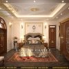 Có lẽ ai cũng không thể rời mắt bởi vẻ đẹp đầy ấn tượn, sang trọng, quyến rũ khi đặt chân vào ngôi nhà, không gian phòng khách với bộ bàn ghế vô cùng hoành tráng phong cách hoàng gia sang trọng, cả căn phòng lộng lẫy, xa hoa với hầu hết đồ nội thất làm bằng gỗ tự nhiên với rất nhiều nét chạm khắc hoa văn tinh tế.
