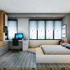 Không gian đọc sách làm việc và phòng ngủ chính được ngăn hờ với nhau bằng vách ngăn hở kiểu hình học đẹp, sang trọng. Toàn bộ sàn phòng được ốp gỗ công nghiệp chống ẩm giúp phòng luôn ấm đông mát hè, bền đẹp với thời gian sử dụng lâu dài.