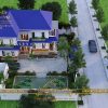 Dưới góc nhìn từ trên xuống, ngôi biệt thự nổi bật với mái thái tối màu. Kiến trúc mái nhật có độ dốc vừa phải, phù hợp cho việc thoát nước mưa. Ngoài ra, một đường ống được thiết kế từ đường thoát nước mưa của mái để trữ nước, thuận tiện cho việc tưới cây trong khu vực vườn.